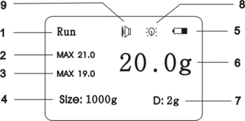 1:“Run”为运行状态, “Hold”为锁定状态; 2:最大张力值; 3:最小张力值; 4:张力表的最大量程; 5:电源显示; 6:张力测量值; 7:张力表测量精度; 8:背光灯指示; 9:蜂鸣器指示。