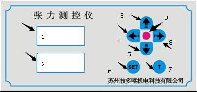 前面板操作简介: 1.初始界面下。在上图的1号位置显示为设定张力,2号位置显示实时张力。此时可以进行的操作是: A:长按“T”按键。进行清零操作。清零操作成功的标志为状态指示灯闪烁一下。 B:短按“SET”按键。进入“设定张力”界面。在张力设定界面中,状态指示灯红灯亮起。 2.设定张力界面。此时可以进行的操作是: A:短按“SET”按键进入张力值设定界面(上图的1号)状态指示灯为红色:单位是‘克’(根据所用线径对应的张力值) 在上图1号位置,张力数值显示会持续闪烁。可以通过“左移”(4号键)或者“右移”(8号键)进行移位操作,来选择调整位。选择好调整位之后,可以通过“数据加”(3号键)或者“数据减”(5号键)进行数据的调整,通过上述数值调整来完成张力值的设定。 B:按下“SET”键进入张力调整界面(上图的1号)状态指示灯切换为白色。默认显示是“21.00”。“2”为界面标识,不能进行调整。其余三位可以进行调整,调整的数值越大输出张力也就越大反之张力变小,张力大小的调整完全按照使用线径所设定的张力值参数所显示数值来做调整(上图2号位置实时显示张力值和上图1号位设定张力值一致)。张力设定调整结束。 C:短按“SET”按键,退出调整界面。状态指示灯熄灭。