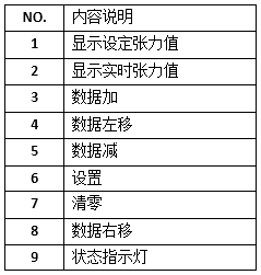 前面板操作简介: 1.初始界面下。在上图的1号位置显示为设定张力值(PLC输入0-5V电压,表示0-5000克张力),2号位置显示实时张力。此时可以进行的操作是: A:长按“T”按键。进行清零操作。清零操作成功的标志为状态指示灯闪烁一下。 B:短按“SET”按键。进入“张力参数调整”界面(上图的1号)。在张力调整界面中,状态指示灯红灯亮起 2.张力参数调整界面。此时可以进行操作是: A:张力大小调整 按下“SET”键进入张力调整界面(上图的1号)。默认显示是“21.00”。“2”为界面标识,不能进行调整。其余三位可以进行调整,调整的数值越大输出张力也就越大反之张力变小,张力大小的调整完全按照使用线径所设定的张力值(模拟量输入0—5V等于0—5000g)参数所显示数值来做调整(上图2号位置实时显示张力值和上图1号位设定张力值一致)。张力设定调整结束。 对应的调整位会持续闪烁。可以通过“左移”(4号键)或者“右移”(8号键)进行移位操作,来选择调整位。 选择好调整位之后,可以通过“数据加”(3号键)或者“数据减”(5号键)进行数据的调整。张力调整界面参数和模拟量输入张力设定值成正正比关系。 B:短按“SET”按键,退出调整界面。状态指示灯熄灭。