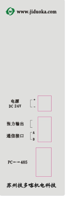 后面端口为接线端口: 上面端口为2脚电源接口:最上为输入电源的正极,下面为输入电源的负极。 中间端口为4脚插口:上面两位是磁滞器接口。不分正负极性 下面两位为联机通信接口。 下面USB插口:电脑连接插口。电脑端需要配置USB转485通信模块 JDKZ闭环控制张力架走线图:
