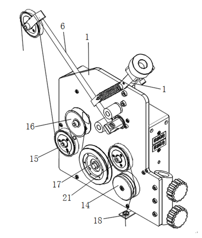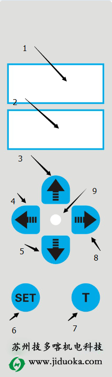 前面板操作简介: 1.初始界面下。在上图的1号位置显示为设定张力,2号位置显示绕线工作时的实时张力。此时可以进行的操作是: A:长按“T”按键。进行清零操作。清零操作成功的标志为状态指示灯闪烁一下。 B:短按“SET”按键。进入“设定张力”界面。在张力设定界面中,状态指示灯白灯亮起。 2.设定张力界面。此时可以进行的操作是: A:短按“SET”按键进入张力值设定界面(上图的1号)状态指示灯为红色:单位是‘克’(根据所用线径对应的张力值) 在上图1号位置,张力数值显示会持续闪烁。可以通过“左移”(4号键)或者“右移”(8号键)进行移位操作,来选择调整位。选择好调整位之后,可以通过“数据加”(3号键)或者“数据减”(5号键)进行数据的调整,通过上述数值调整来完成张力值的设定。 B:按下“SET”键进入张力调整界面(上图的1号)状态指示灯切换为白色。默认显示是“21.00”。“2”为界面标识,不能进行调整。其余三位可以进行调整,调整的数值越大输出张力也就越大反之张力变小,张力大小的调整完全按照使用线径所设定的张力值参数所显示数值来做调整(上图2号位置实时显示张力值和上图1号位设定张力值一致)。张力设定调整结束。 C:短按“SET”按键,退出调整界面。状态指示灯熄灭。