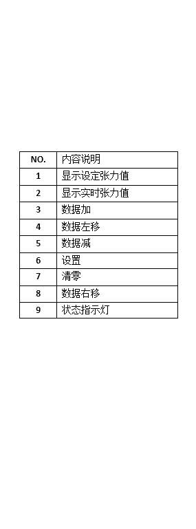 3.张力值报警上下限调整设定: 长按“数据加”3号键三秒钟,红灯亮,设定上限张力值。 长按“数据减”5号键三秒钟,白灯亮,设定下限张力值。