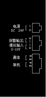2脚电源接口:正负极 4脚接口:1-2脚报警输出(24V开关量信号) 3-4脚0-10V模拟量输入(MB型号用) 6脚功能接口:1-2通讯联机接口 3-4通讯联机接口 5-6两脚张力电压输出(监测用) 备注:报警输出是电压24V开关信号