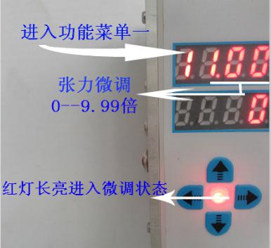 按”SET”进入红灯常亮,在绕线机工作时通过调整菜单“1”张力微调“1.00”(微调值“0—9.99)数值越大张力越大反之张力则会越小)通过张力微调来精确锁定你设定的张力值,设定好以后数值将自动保存,见下图)”