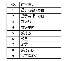 中间端口为4脚插口:上面两位是报警输出接口。有正负极性(长按3号位置设定上限张力,长按5号位置设定下限张力)